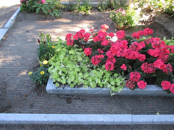Hier kommen die Fotos. Zuerst mal die Übersicht über den Standort. An den Pelargonien meine ich zu erkennen, dass es auf dieser Fläche keinen gravierenden Nährstoffmangel geben sollte. Ich kann mich allerdings nicht erinnern, ob ich dort Dünger (Floranid permanent 3M) ausgebracht habe oder nicht. (Oder ob ich vielleicht nur den Streifen mit den Pelargonien gedüngt habe oder wie auch immer. Ich wusele auf mehreren Grabstellen rum und bringe das ggf. durcheinander.)