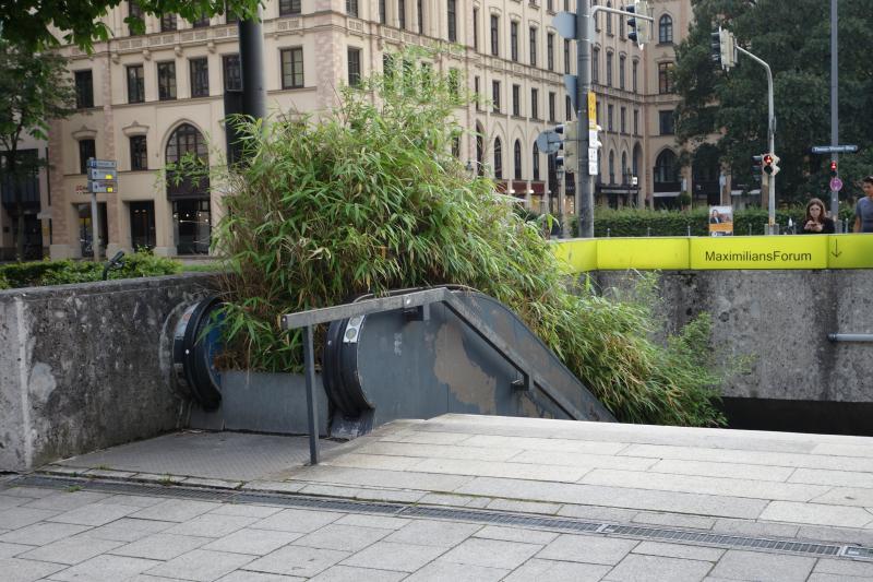 Vielleicht ist der Bambus ja gar nicht da eingesperrt, sondern aus einem Kübel im Untergrund ausgebüxt, und nun hat er bereits die Rolltreppe erobert und schickt sich an, den Rest der Stadt zu übernehmen. ;D