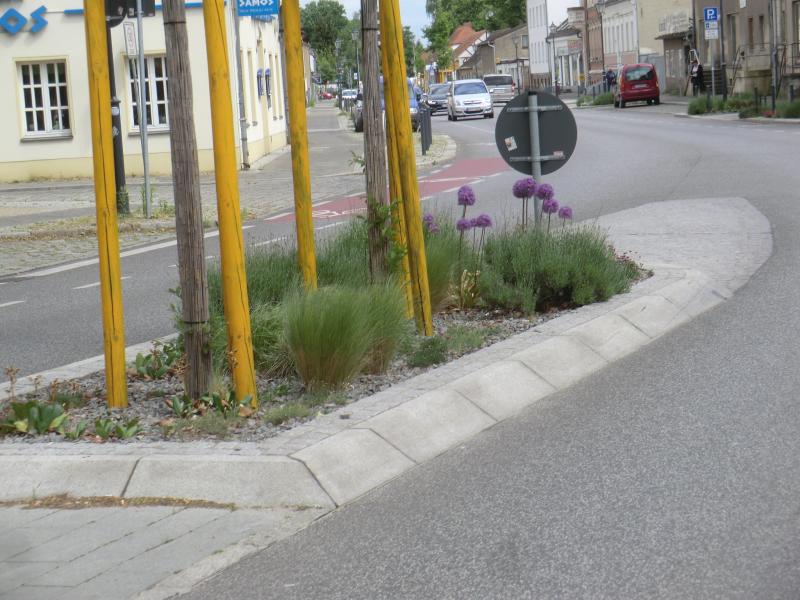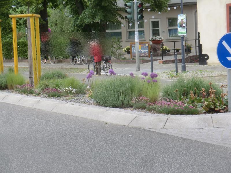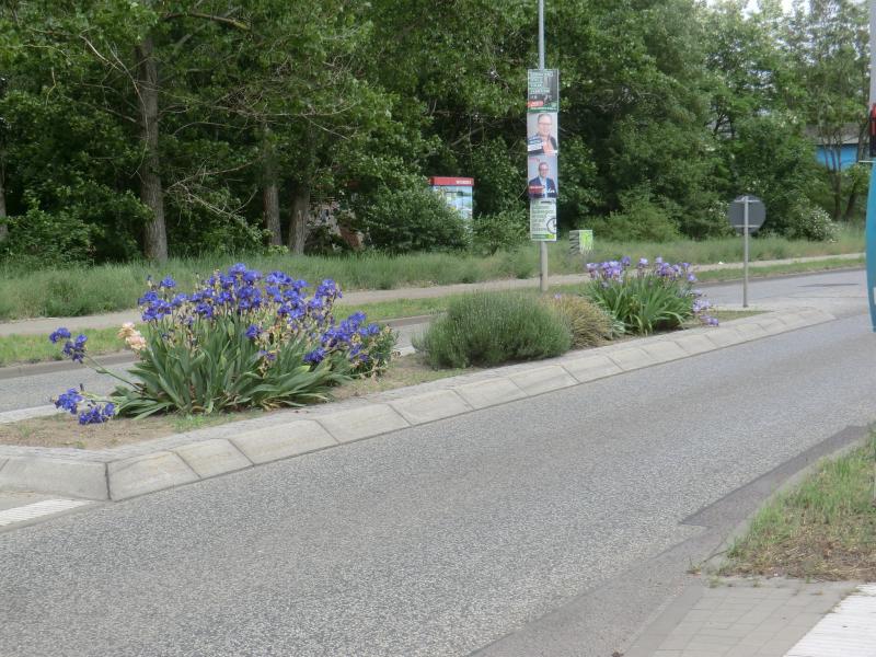 Weiter draußen (Bhf Teltow) waren die Verkehrsinseln nicht mehr so schön. Es lag kein Kies, sondern nur nackige Erde und von vielen Pflanzen war nichts mehr zu sehen. Oft sahen nur noch die Iris gut aus.