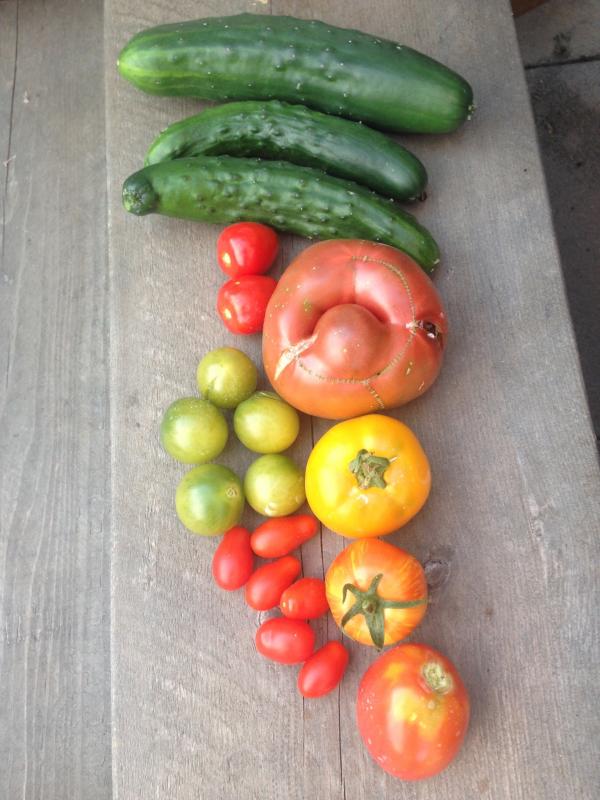 Tomaten, jetzt sind immer mehr reif. So früh hatte ich noch nie so viele :D und Gurken. Nicht im Bild: rote sähschalotten und eine Peperoni.
