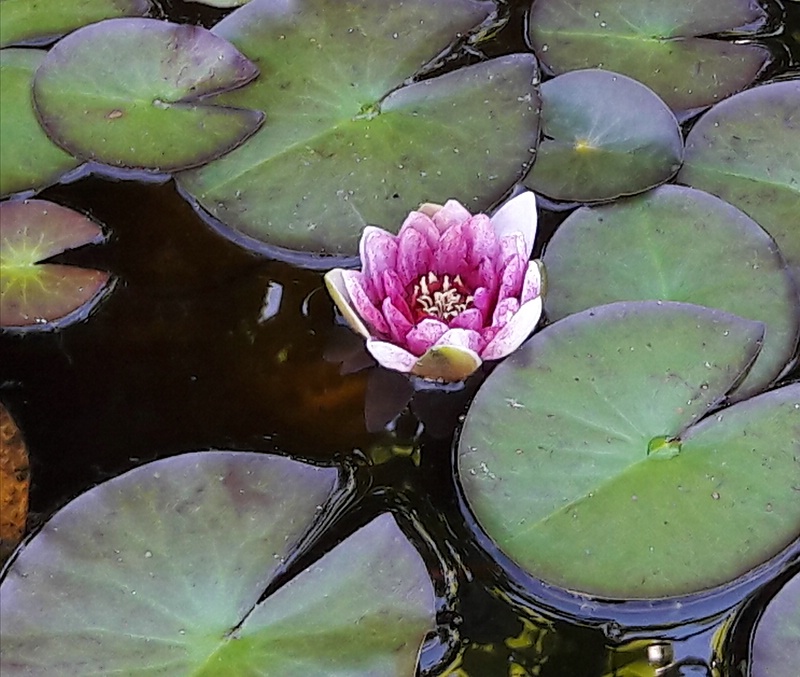 Und dann blüht inzwischen eine der kleineren Seerosen! Und nicht in einer unerwünschten Farbe - nein, sie passt genau in mein Farbschema.