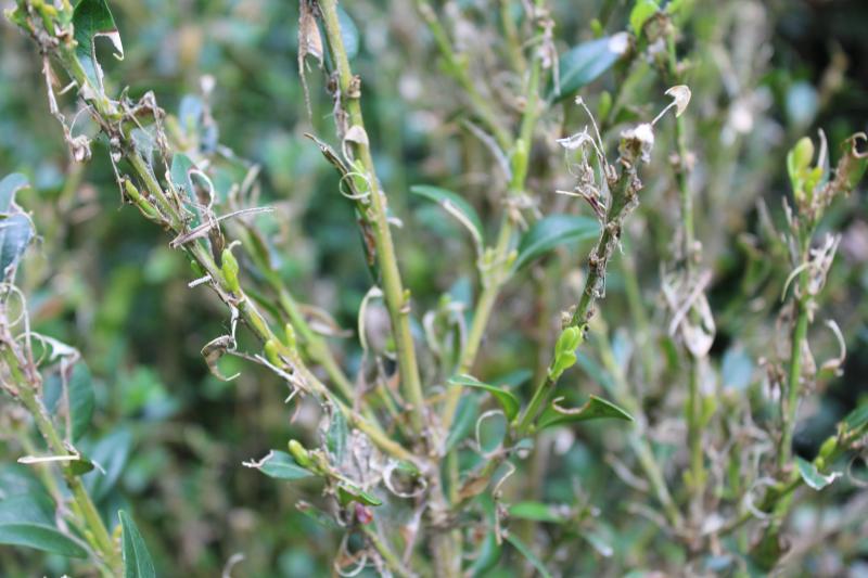 Ich habe dort nachgesehen und am/im Bux ein wenig Gespinst mit etwas Gekrümel gesehen, aber keine Raupen.