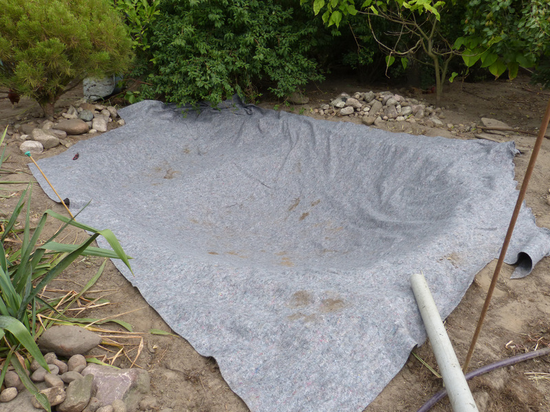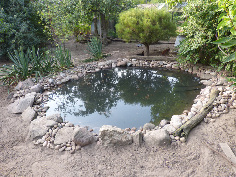 Ich habe mich heute wetterentsprechend mit dem Wasser im Garten beschäftigt. Nachdem ich den Teich im Hühnergarten vor kurzem komplett ausgeräumt habe, kam letzte Woche die neue Folie rein. Ein Foto im frisch befüllten Zustand habe ich vergessen, ich habe nur eins gemacht, als das Vlies in der Teichgrube lag.