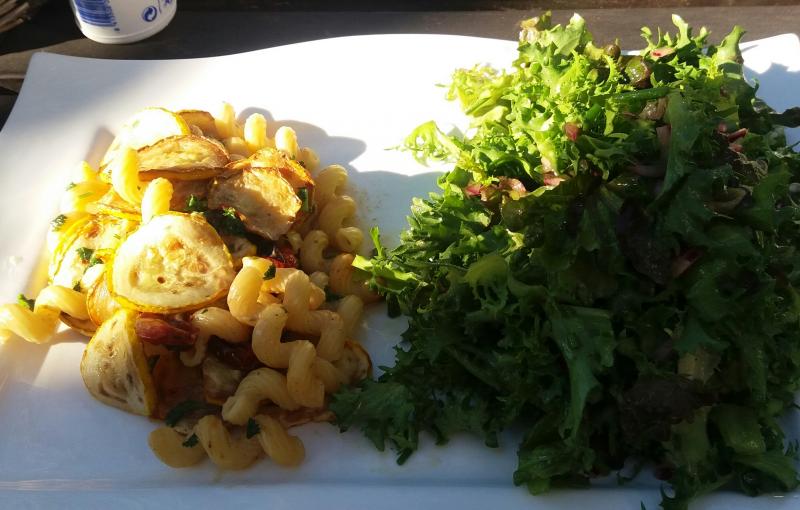 salat aus den (vorerst?) letzten gartengurken, tomaten und schafskäse mit gut olivenöl, schopskasalat heißt das wohl. lecker und undokumentiert sofort inhaliert. ;)