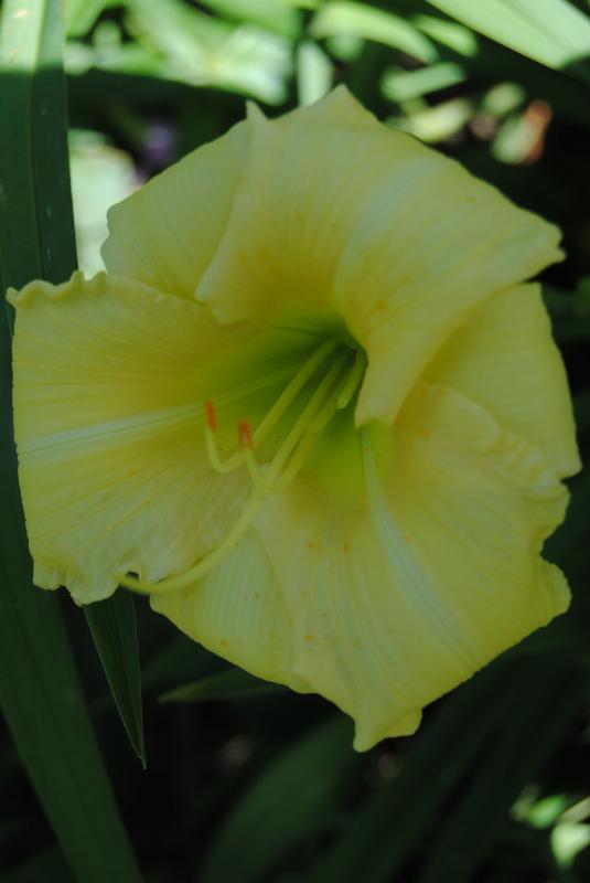 Der ist heute aufgeblüht und live spannend - große Blüte mit sehr dicke Substanz, gerüscht, die Blütenblätter sind stark nach hinten gebogen, die Oberfläche glitzert vor 'diamond-dusting' (Diamant-Bestäubung), der Schlund schimmert sehr grün: