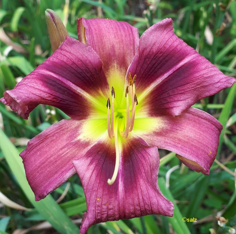 Der ist heute aufgeblüht und live spannend - große Blüte mit sehr dicke Substanz, gerüscht, die Blütenblätter sind stark nach hinten gebogen, die Oberfläche glitzert vor 'diamond-dusting' (Diamant-Bestäubung), der Schlund schimmert sehr grün:
