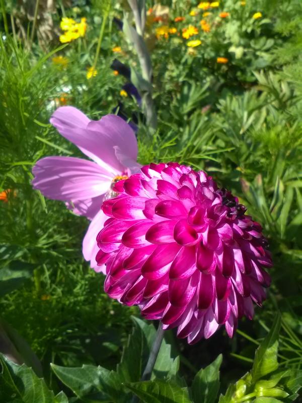 Eigentlich wächst da hauptsächlich Schnittknoblauch, Schnittlauch, Basilikum, Fenchel und Soja aber es haben sich so viele Blumen aus anderen Ecken selbst ausgesamt und ich bin zu schwach, die dann auszureißen :-[