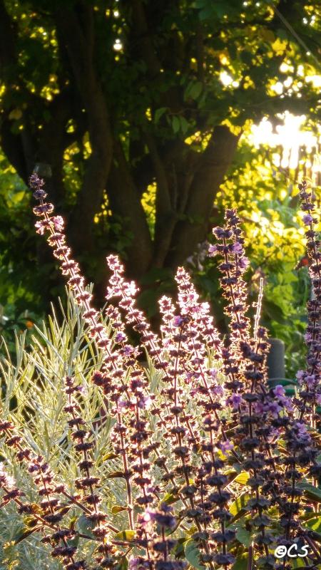 Meine Kräuterblume mit Basilikumblüten im letzten Abendlicht...