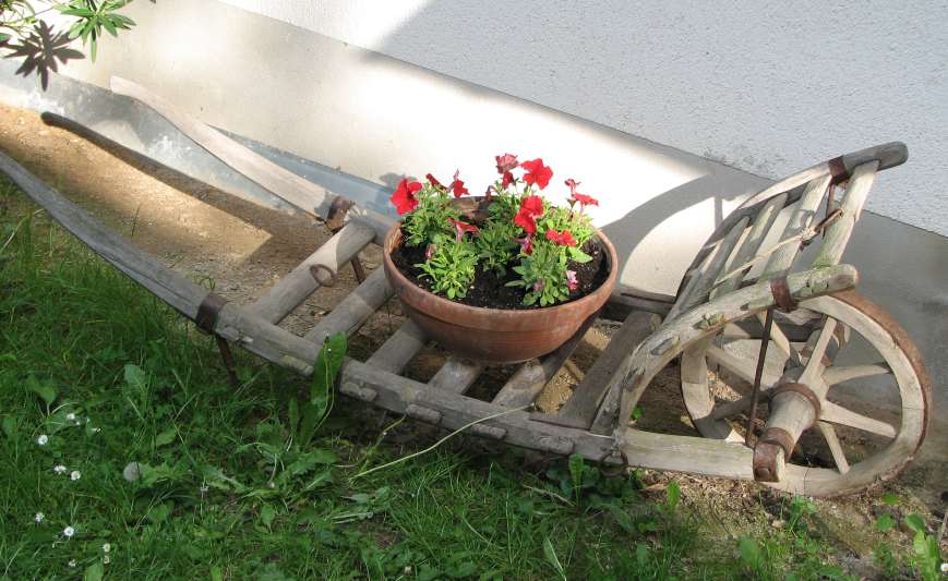 Blumentransport gefälligPetunien auf alter Transportkarre. Bei meinen Großeltern auf dem Hof wurde auf dem in erster Linie Gras transportiert.