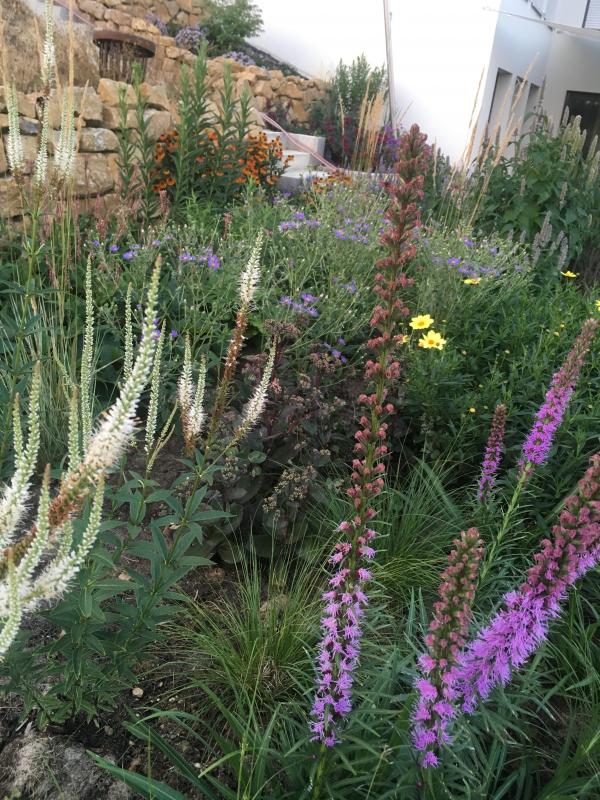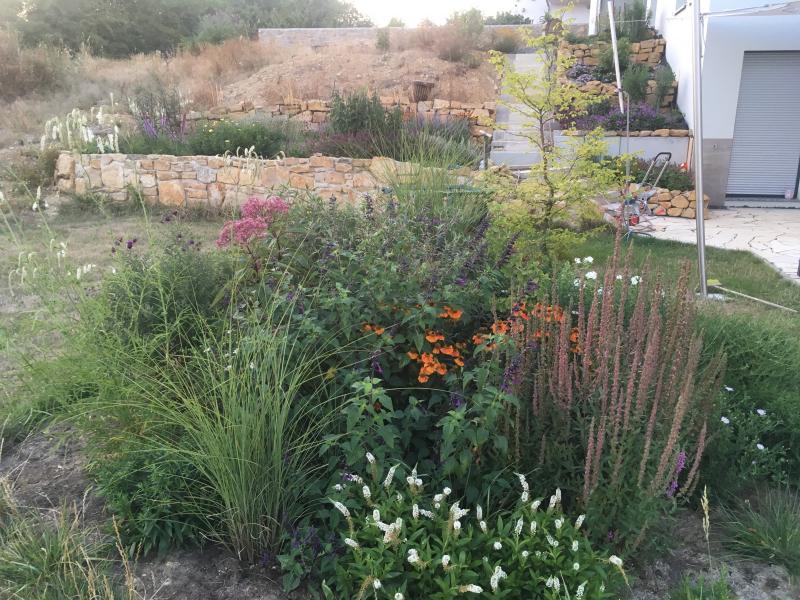Gieße lieber nicht zu viel, die Pflanzen sollen sich ja auch an die Trockenheit gewöhnen und ordentlich Wurzeln bilden. Vor allem beim Kiesbeet kann man schon gut die geplante Anmutung erkennen, sehr hübsch. :)
