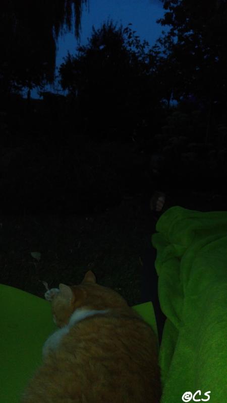 Mensch und Miez genießen den Garten. Miez ist sehr gut gelaunt, kuschelt mit uns, dann ein Schläfchen im Colakraut.