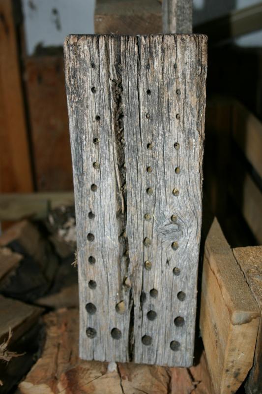 Dieser Wildbienennistklotz begleitet mich seit ungefähr 1980, Eiche, mittlerweile sehr rissig, etwas angemorscht. Wir sind 5x miteinander umgezogen. Wie es aussieht, ist er immer noch bewohnt? Jedenfalls sind einige der Löcher mit Lehm verschlossen.