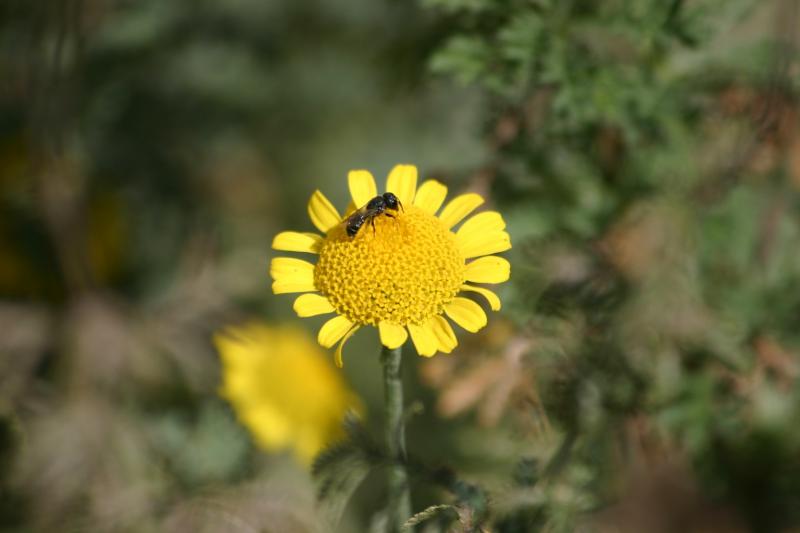 Ist das eine Wildbiene, und wenn ja, können die Profis hier die Art bestimmen? Ich schätze die Größe auf etwa 5 mm. Sehr "umtriebig", bleibt immer nur kurz auf der Färberkamillenblüte.