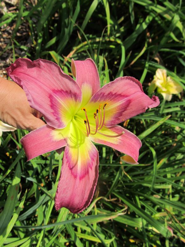 Sehr großblütig und spät - völlig unerwartet in der Optik (Mutter ist ein großblütiger Sämling in kupferrot, Vater ist Song Writer in Pink mit tollem Rüschenrand):