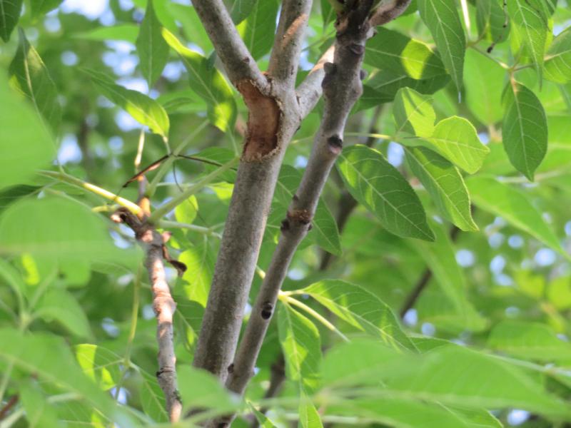 Hier hat der Hornissenbefall zwei Edelflieder fast umgebracht - die Rindenschäden waren so massiv, daß einige Äste abgestorben sind. Die Fehlstellen haben sich bis heute nicht ausgewachsen.