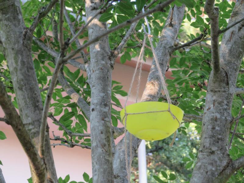Da dachte ich mir ganz schlau: ich hänge eine Schale an die Regenrinne (knapp einen Meter vom Baum), noch eine Schale etwas weiter und dann immer weiter bis ich die Hornissen vor dem Haus in den Hainbuchen füttern kann.