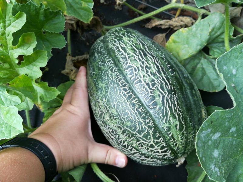 Hier ist noch eine andere Sorte Wassermelone. Insgesamt habe ich 19 verschiedene Wassermelonen und 20 verschiedene Zuckermelonensorten angebaut.