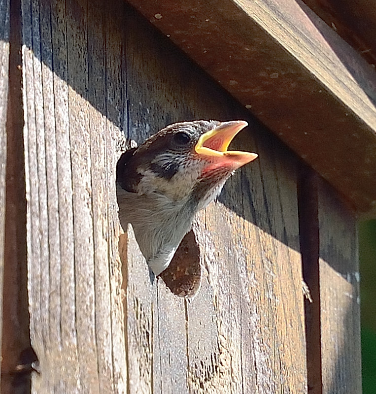 Diesem Spatzenkind war es definitiv zu heiß :-\ Am nächsten Tag wurde der Nistkasten verlassen...