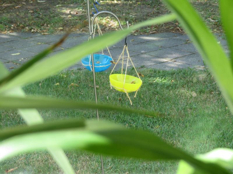 Soweit so gut, allerdings gibt es noch in einigen Punkten Verbesserungsbedarf: Erstens, die Schalen, die ich aufgehängt habe, scheinen von den Tieren nur schwer anzufliegen zu sein. Ich hatte dann abgeflachte Steine hineingelegt, damit sie darauf landen können. Im Ergebnis sind allerdings einige Hornissen ersoffen. Also nicht so die pralle Idee. Nach geeigneten Gefäßen suche ich also noch.