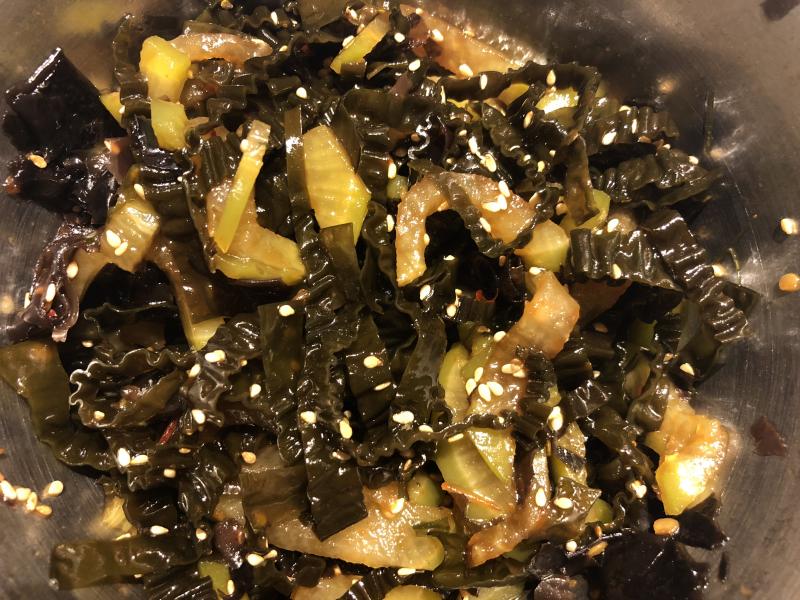 und als beilage zuckerkelp-korearettich-salat, wakame-ähnlich, ich habe ihn scharfsüßsauer abgeschmeckt