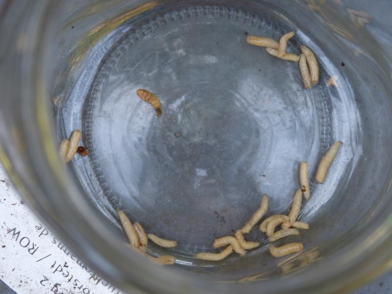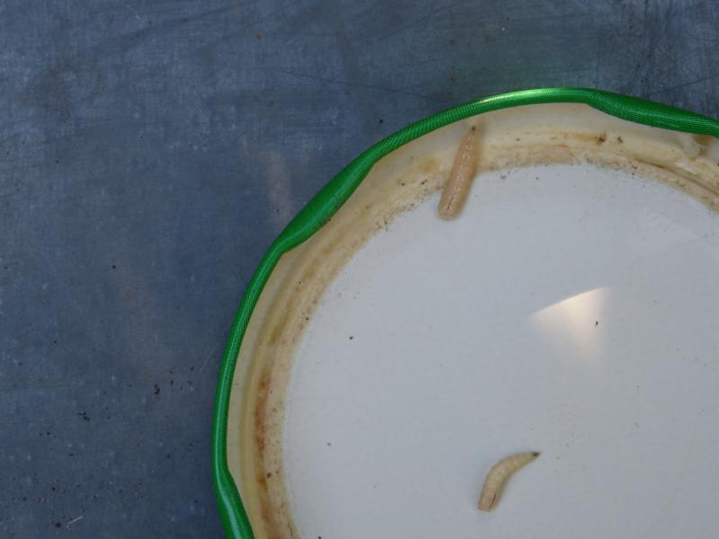 Heute krabbelten die im Bild zu sehenden Maden beim Öffnen der Mülltonne aus ihr heraus.