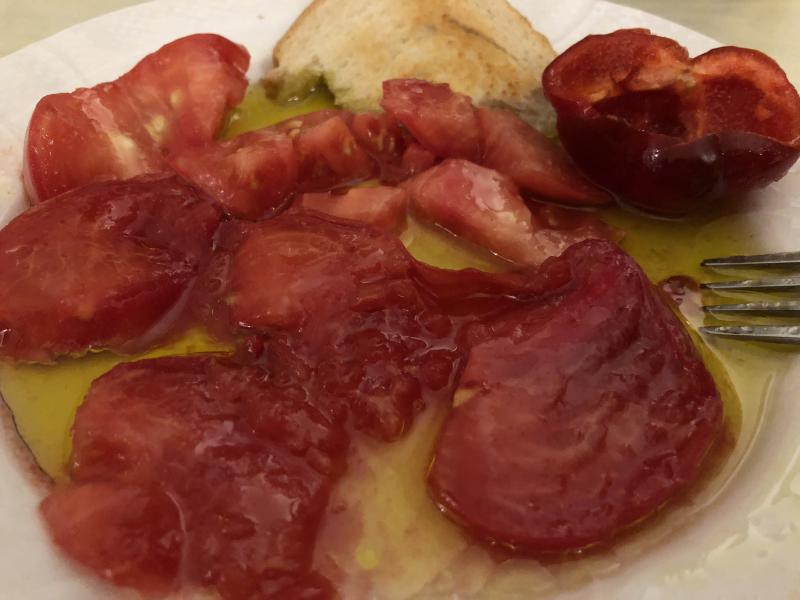 hier tomate und kirschpaprika frisch aus dem garten, mit olivenöl, meersalz und toast