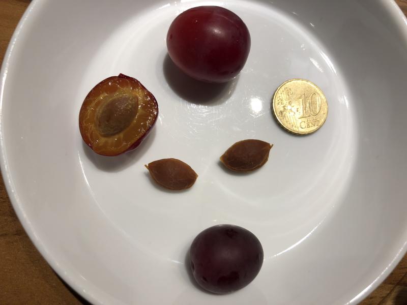 so etwas ähnliches habe ich gerade am sonntag bei uns in der kleingartenanlage entdeckt, die früchte sind etwas rötlicher und kaum bereift, aber winzig, halbwegs zwetschgenförmig, nicht steinlösend und lecker. die steine sind eher wie bei einer mirabelle breit-ellipsoid.