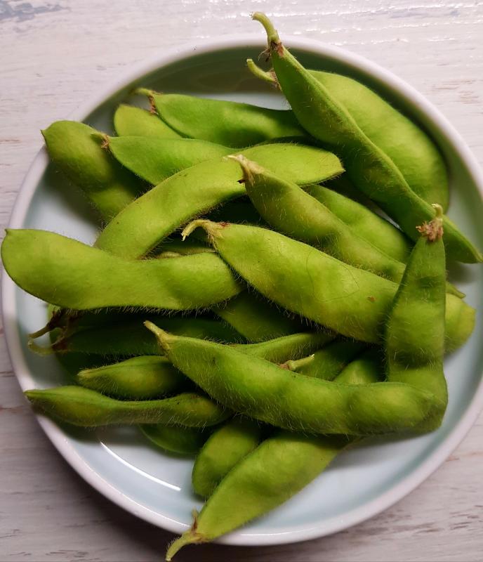Neben Tomaten und Gurken heute die erste (zugegebenermaßen kleine) Handvoll grüne Sojabohnen für Edamame geerntet.