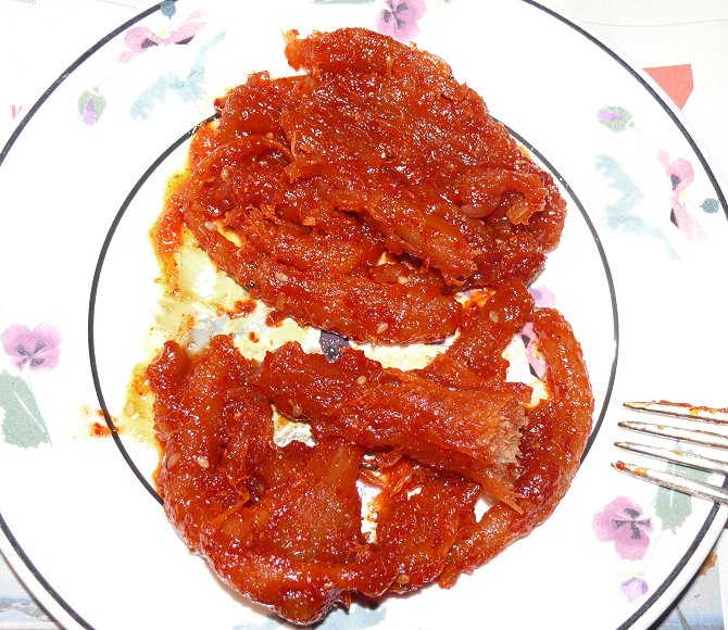 Ich hab mich jetzt erbarmt und die gewürzte Codonopsis gegessen, obwohl ich noch satt vom Rosenkohl untereinander war.