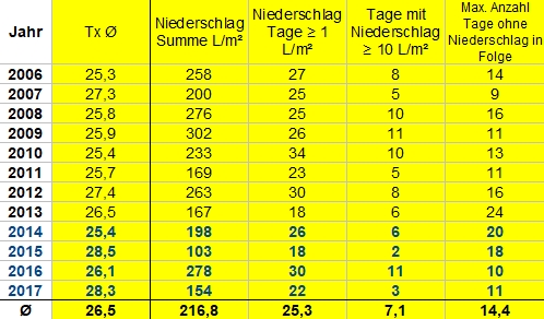 Ergänzend die genaueren Niederschlagsdaten und noch ein paar andere interessante Details seit 2006 für den Sommer (JJA), Jahr für Jahr. Beachte auch die längste Periode ohne Niederschlag.