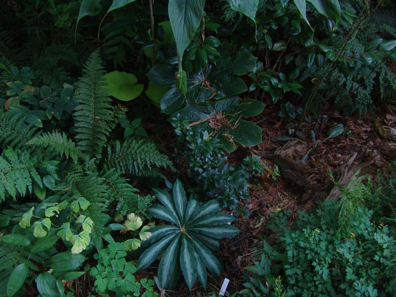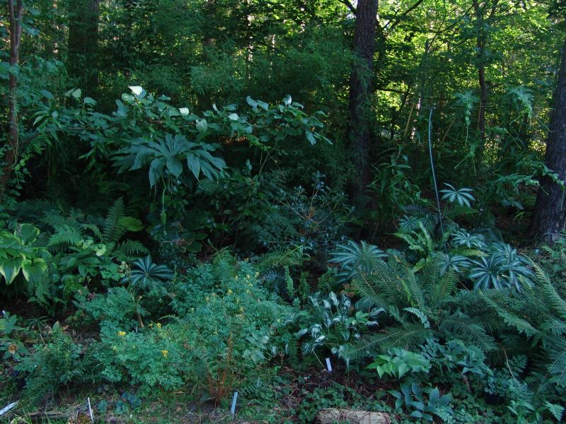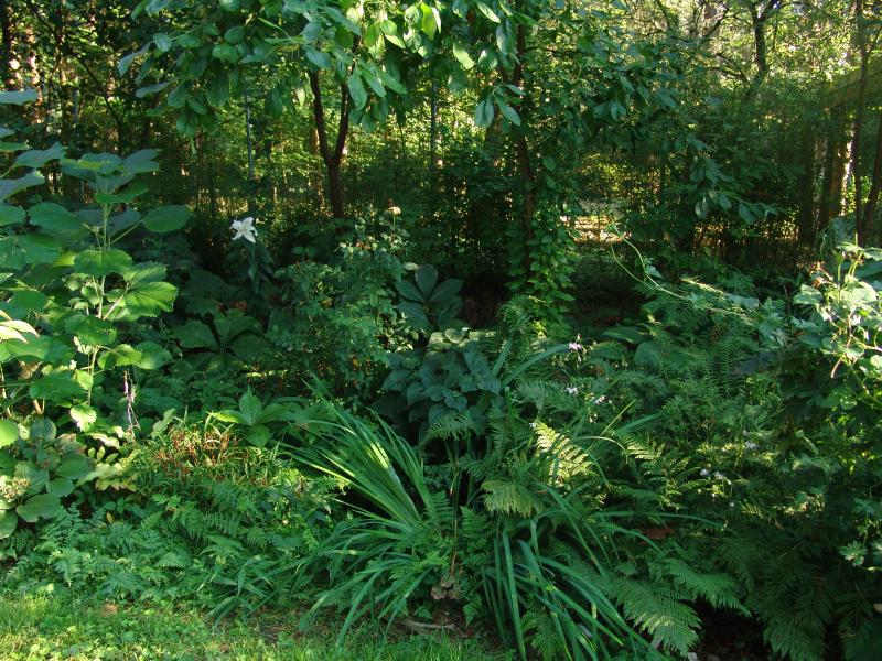 Blick auf einen Teil meiner quasi 'Lauwarmrotte' (vorwiegend Abraummaterial, bepflanzt mit allerlei blumigem und gemüsigem (Rhabarber, im Frühjahr gesetzt und monströs gewachsen, im Vordergrund vergessene und zu spät gesetzte Kartoffeln), was mir so in die Hände fiel/fällt: