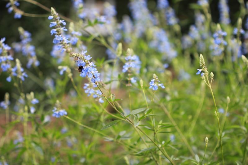 Salvia uliginosa wird immer üppiger, im Laufe des Sommers. Leider trifft meine Kamera das wunderbare Himmelblau immer zu blass.