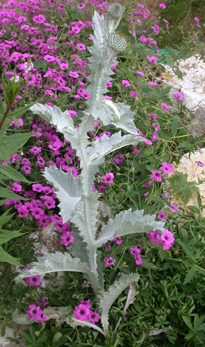 Onopordium acanthium setzt sich farblich schön von Geranium-hybr. Patricia ab.