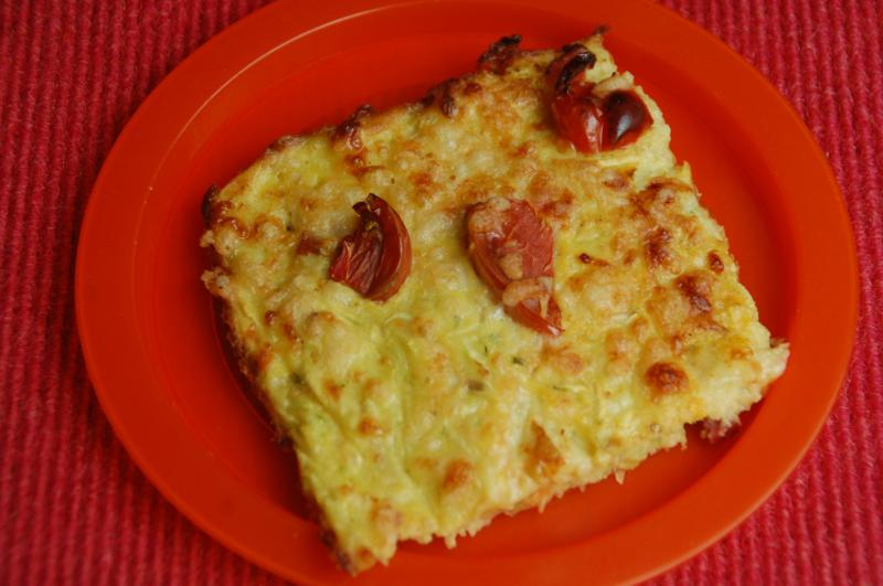 Hier gab es Zucchinipizza (Zucchini, Zwiebel, Ei, Mehl, Schinkenwürfel, geraspelter Käse, Öl, S&P, Knoblauchpulver, Tomaten).