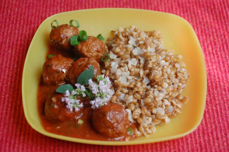 Weizen mit Fleischbällchen in Knoblauch-Oregano-Tomatensoße