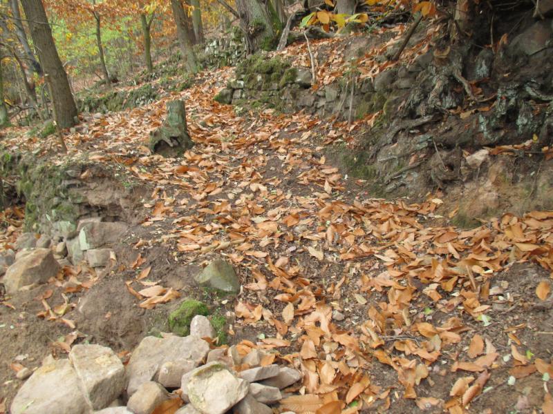 Die Trockenmauer in diesem Bereich sind schon vor Jahrzehnten abgestürzt und werden fleißig als Wildschweinrutschbahn genutzt.