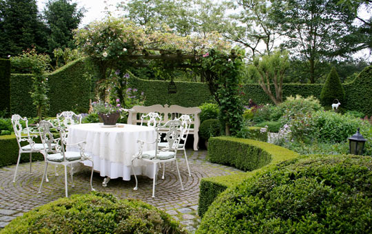 Die weißen Gartenmöbel fanden wir zwar etwas zu schnörkelig, aber hier passen sie rein.