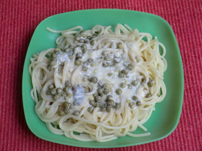 Hier gab es Spaghetti mit Erbsen-Sahne-Blauschimmelkäse-Zwiebel-Soße.