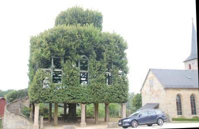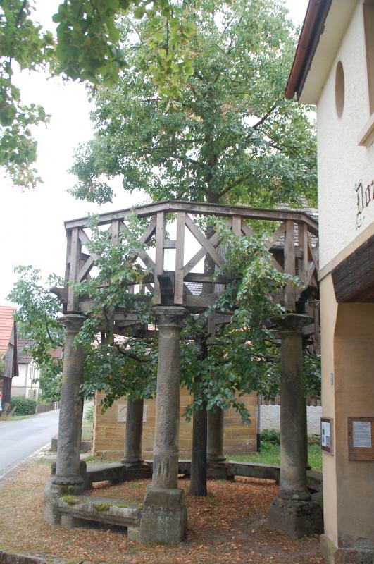 Zuerst waren wir in Neudrossenfeld. Dort ist auch ein Lindenbaummuseum entstanden, welches Modelle ausstellt und Formen und Bedeutung der Bäume als Orte volkstümlichen und kirchlichen Brauchtums erklärt. Direkt daneben steht diese 350 Jahre alte Tanzlinde. Hier ist kein Gerüst zu sehen, nur noch der Baum und die Reste des Stützgerüstes.