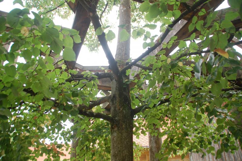 Da man an diesem dünneren Bäumchen die Erziehung noch gut sehen kann, zeige ich ein paar mehr Bilder davon. Die untere Astreihe wird waagerecht auf die Stützbalken geleitet, welche außen auf Säulen liegen.