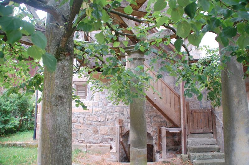 Zuerst waren wir in Neudrossenfeld. Dort ist auch ein Lindenbaummuseum entstanden, welches Modelle ausstellt und Formen und Bedeutung der Bäume als Orte volkstümlichen und kirchlichen Brauchtums erklärt. Direkt daneben steht diese 350 Jahre alte Tanzlinde. Hier ist kein Gerüst zu sehen, nur noch der Baum und die Reste des Stützgerüstes.