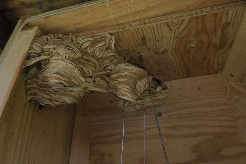 Ein zweites Nest ist an einer Gartengrenze zu einem Nachbarn in einem alten kleinen Geräteschuppen, etwa in Augenhöhe. Eine "Wächterhornisse" sitzt stets auf der oberen Türkante an dem Spalt zum Türrahmen, wo der Einflug ist. Auch da brummt es inzwischen ganz gehörig.