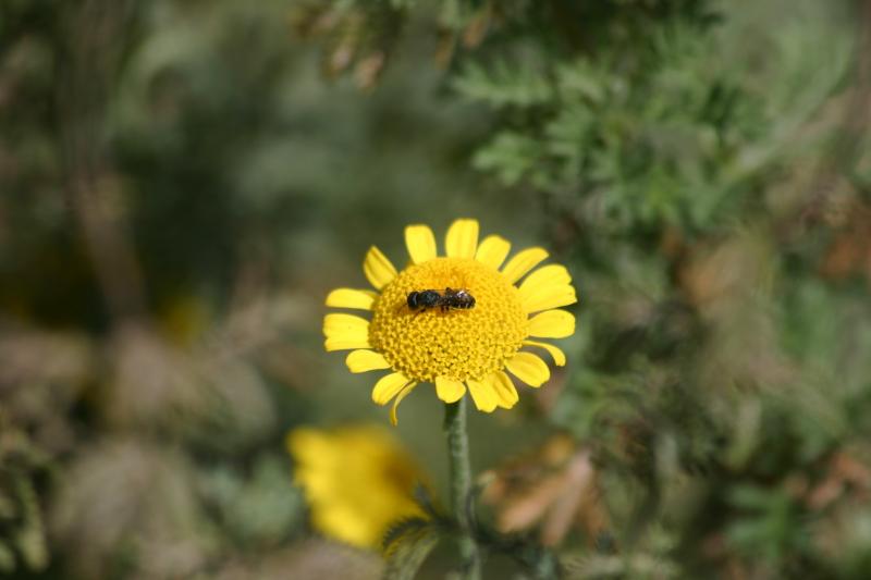 Ist das eine Wildbiene, und wenn ja, können die Profis hier die Art bestimmen? Ich schätze die Größe auf etwa 5 mm. Sehr "umtriebig", bleibt immer nur kurz auf der Färberkamillenblüte.