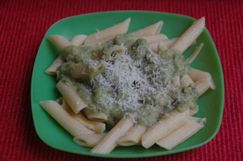 Penne rigate mit grüner Soße (Broccoli, Zucchini, Borretsch, Salbei, Estragon, Salz, weißer Pfeffer, Petersilie) und Parmesan