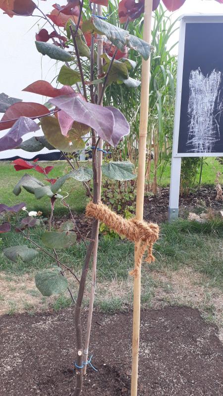 Für sowas nehm ich immer gummiummantelten Draht, der wächst nicht so schnell ein, als 8 um Bambusstab und Trieb gelegt, dass der Trieb auch nicht am Stab scheuert.