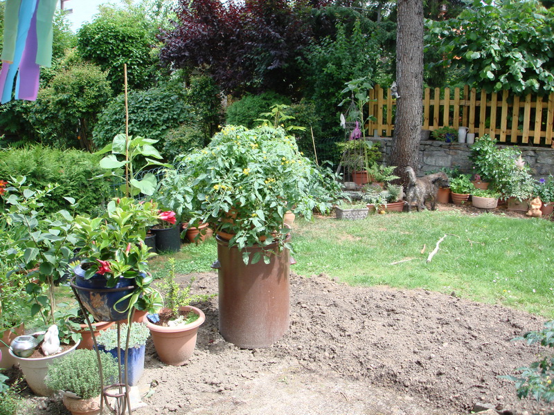 Im ersten Jahr bin ich mit den Töpfen ständig hin und her gezogen. In den Boden wurde erst einmal jede Menge Sand, Kompost, Blumenerde immer wieder eingearbeitet. Er war steinhart und trocken.