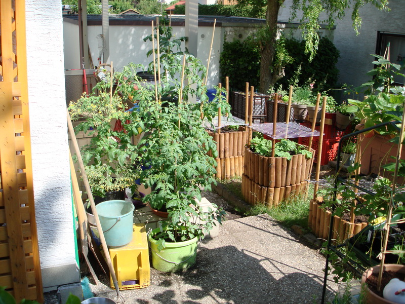 Jede Menge Rumpelecken und dazwischen Kartoffeltürme und am Zaun Hochbeetkisten für Salat etc.