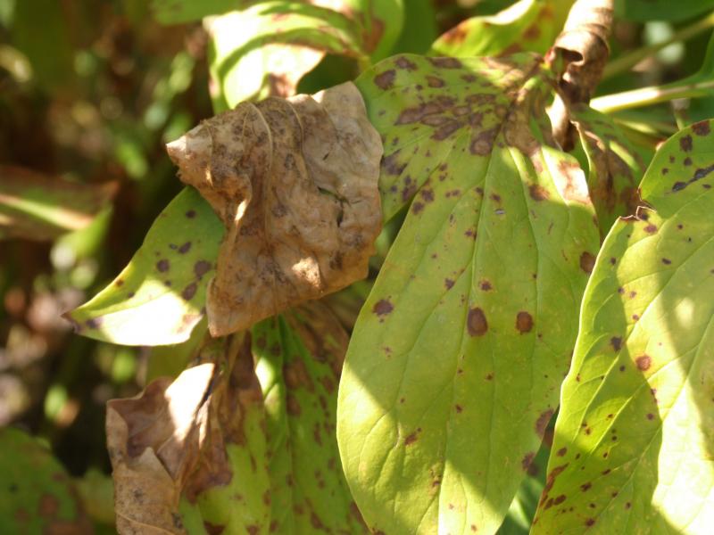 Das extreme Wetter hat bei einigen meiner Päonien einen Pilzbefall befördert, den ich so noch nie beobachtet habe, hier an der sonst kerngesunden ´White Innocence´.