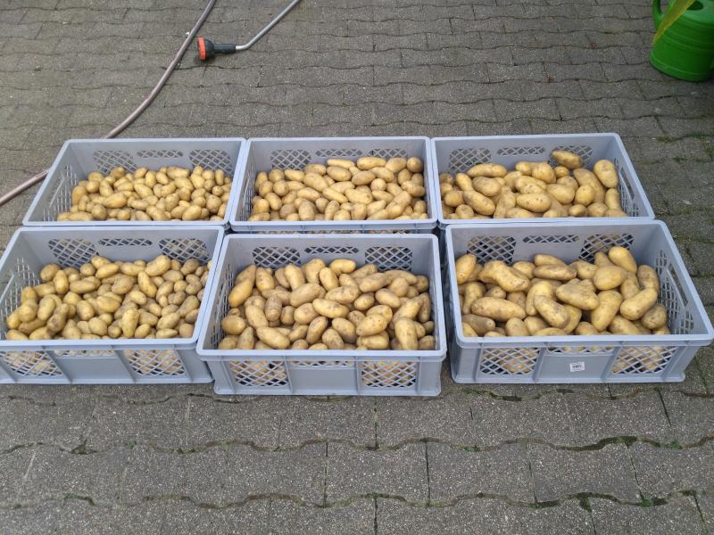 Das Foto zeigt das frühe Ernte und dichter pflanzen eher kleine Knollen bringt. Die Knollen in deinen rechten Kisten sind schon ungewöhnlich groß für Annabelle. Auch hier zeigt sich die Hitze wieder.