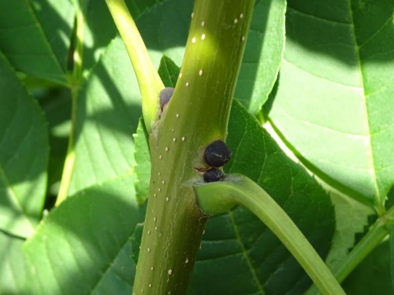 Unsicher macht mich, dass die Eigentümer Stein und Bein schwören, dass hier niemals Eschen waren. Somit drängt sich Eschenaufwuchs weniger auf. Und das ganze sieht so....derb und krautig aus. An der Basis sind größere Pflanzen allerdings verholzt.